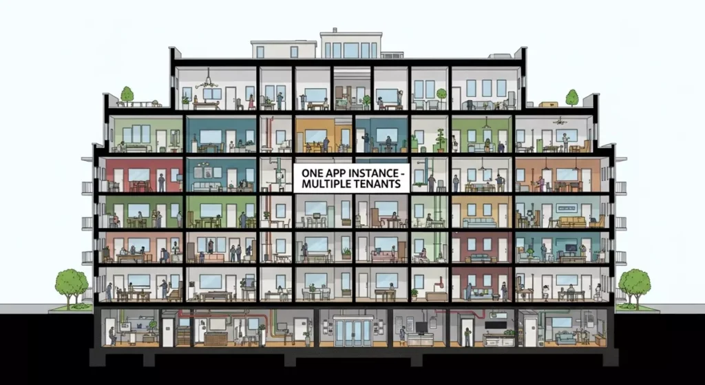Mówiąc najprościej: to architektura, w której jedna instancja aplikacji obsługuje wielu klientów (tenantów). Wszyscy korzystają z tego samego kodu i (zazwyczaj) tej samej bazy danych, ale każdy klient widzi tylko swoje dane. To jak Gmail – miliony ludzi używają tej samej aplikacji, ale nikt nie widzi cudzych maili.